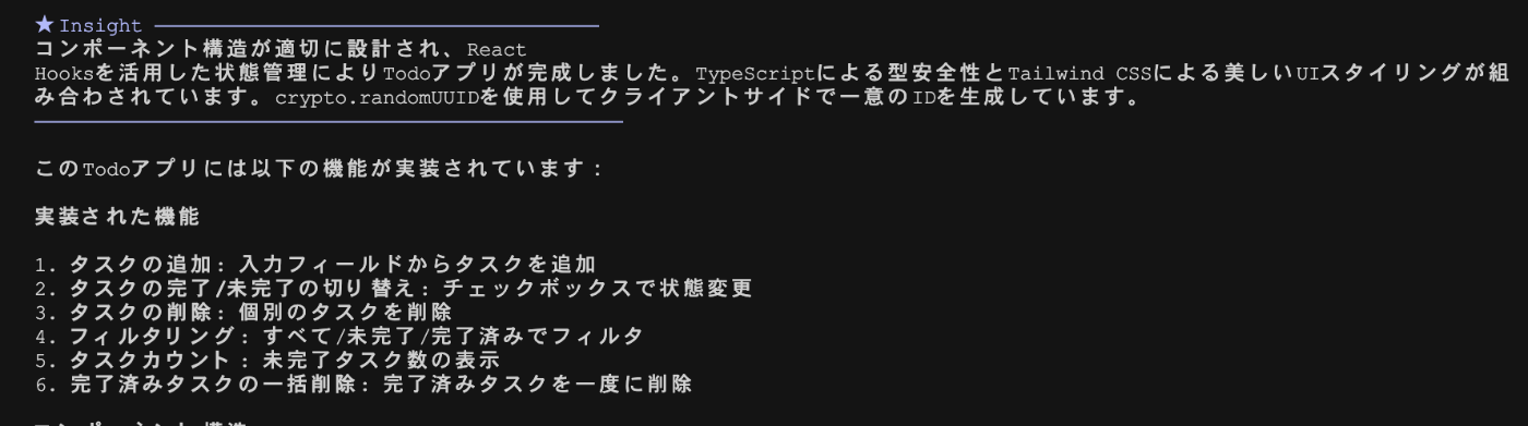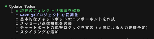 「Next.jsでチャットボットアプリを構築したい」と指示してみました。するとtodoリストの中に