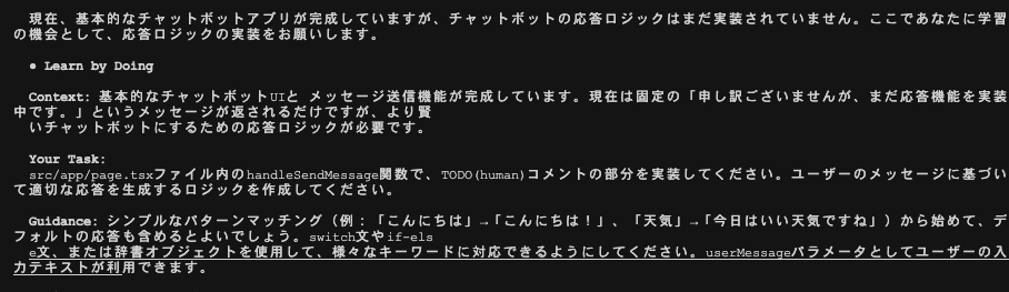 実装を進めてもらうと該当部分の実装をお願いされます。どうやって実装すればいいかヒントまでくれるのは嬉しいですね。